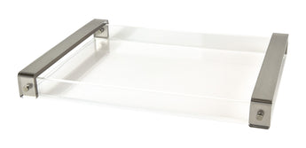 This Clear Tray with Modern Silver Metallic Handles has comfortable, large handles, making this the perfect serving tray. With brushed metal handles, this clear lucite tray lends elegance to your modern vanity or bar.