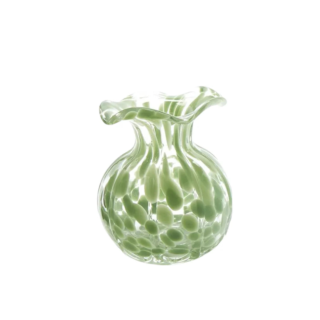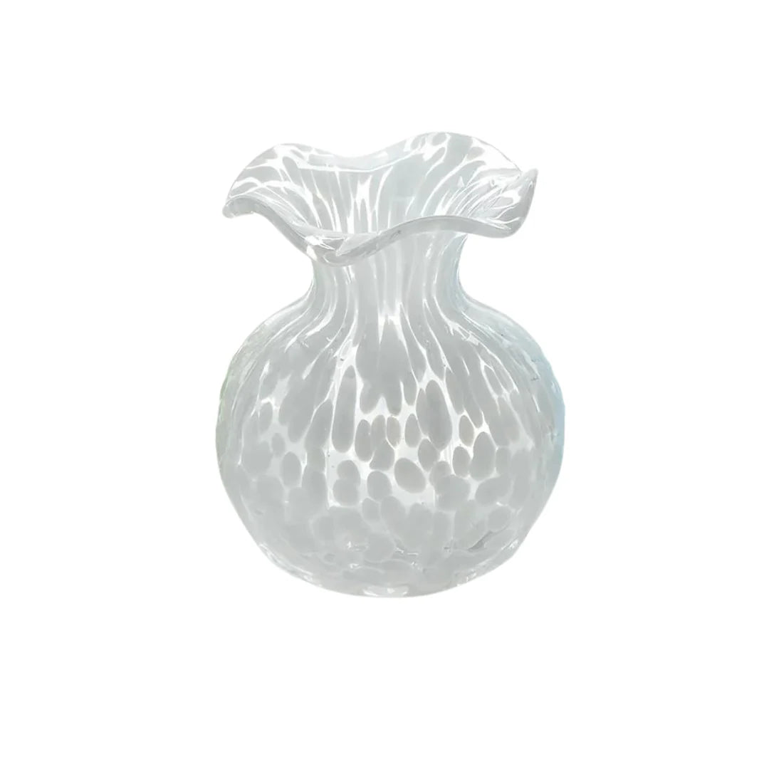 Elevate your floral arrangements with the elegant Ruffled Edge Spotted Vase.. Crafted from delicate glass, this vase comes in three stunning colors White, Blue, and Green, adding a pop of color to any space. Standing at 6 1/4" tall with a 5" diameter, it's the perfect vessel for your favorite blooms.