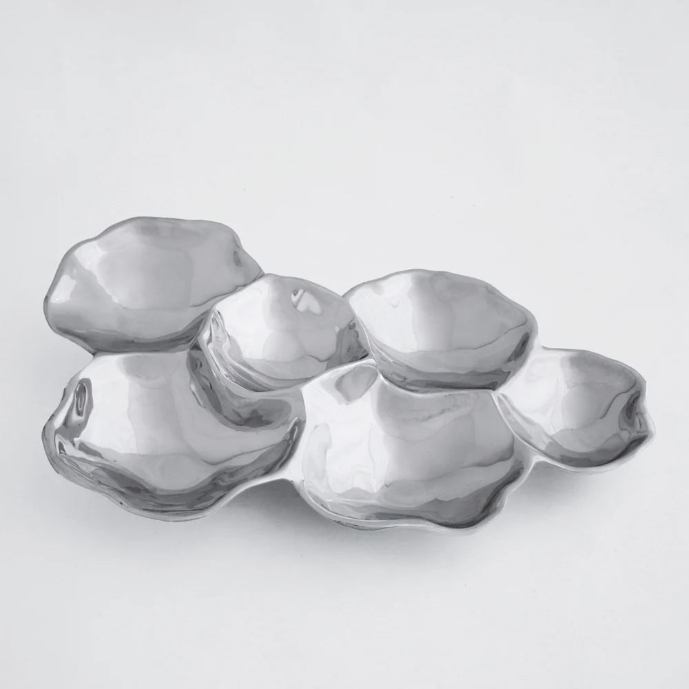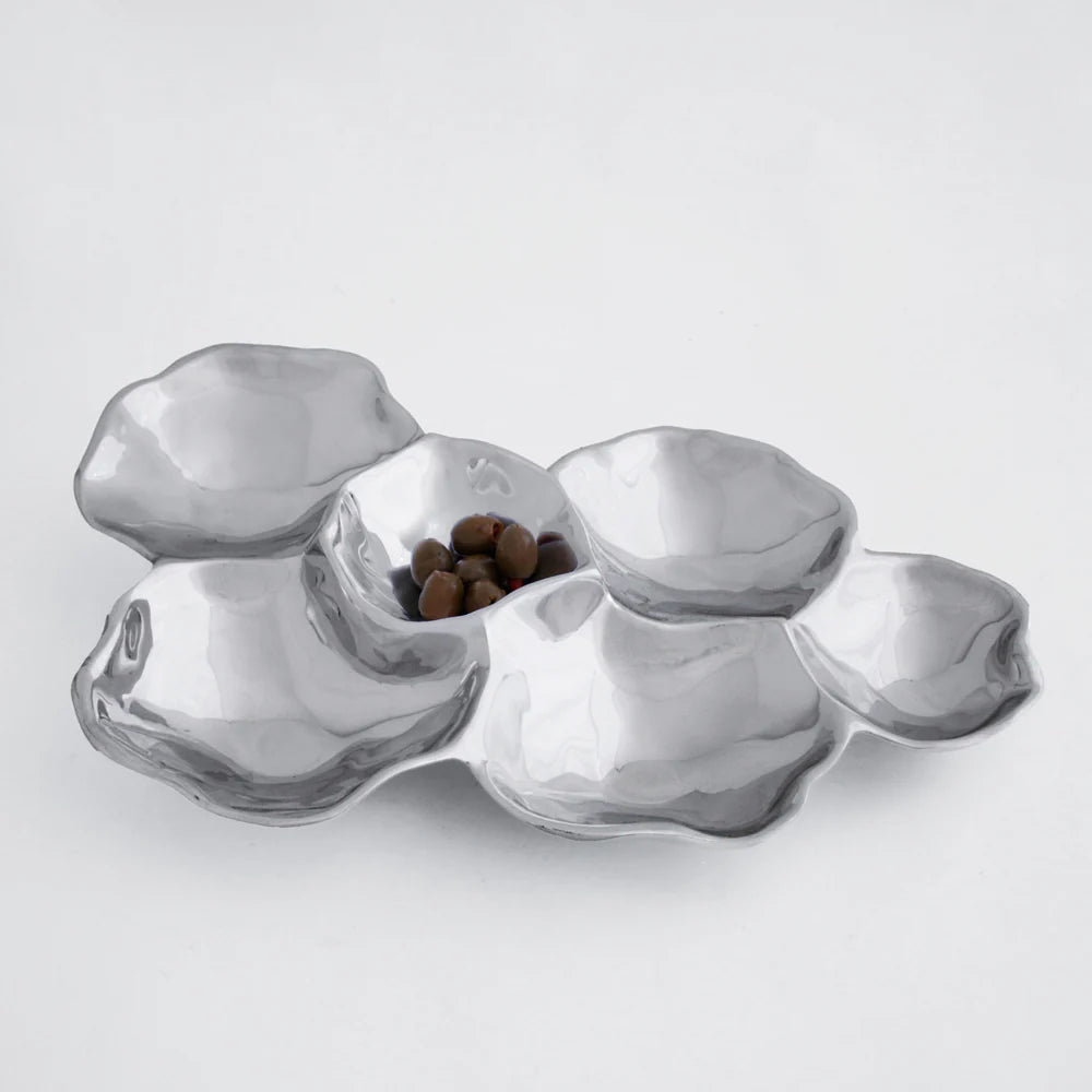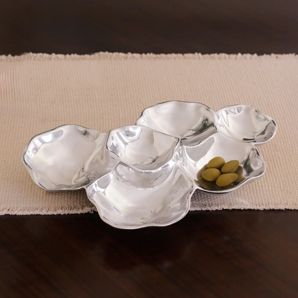 Here's richness! Like a work of modern sculpture for the table, you'll find a thousand uses for the six-chambered Beatriz Ball SOHO Multi Chip and Dip. Its gleaming artistry makes for a great conversation starter at parties. Perfect for dips, tapas, or garnishes. Use to serve nuts, olives, and nibbles at your next get-together. Makes a thoughtful gift. Beatriz Ball’s intensely handmade products employ eco-friendly and sustainable materials and are crafted by artisans who trace a heritage of metalworking for generations. An original Beatriz Ball design, sustainably handmade of a top quality, FDA safe, easy-care aluminum alloy. Hand wash and dry. Dimensions: 15.5" L x 10" W x 1" H
