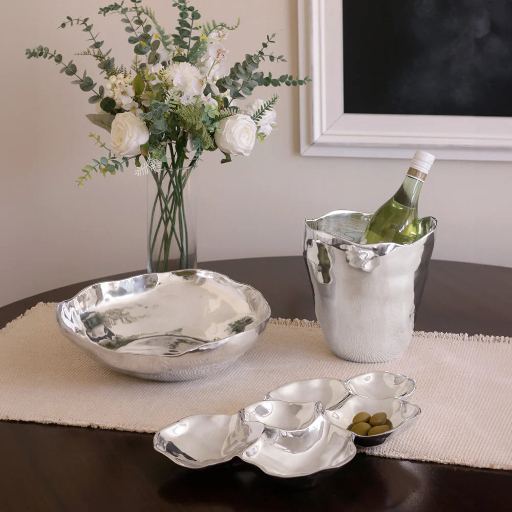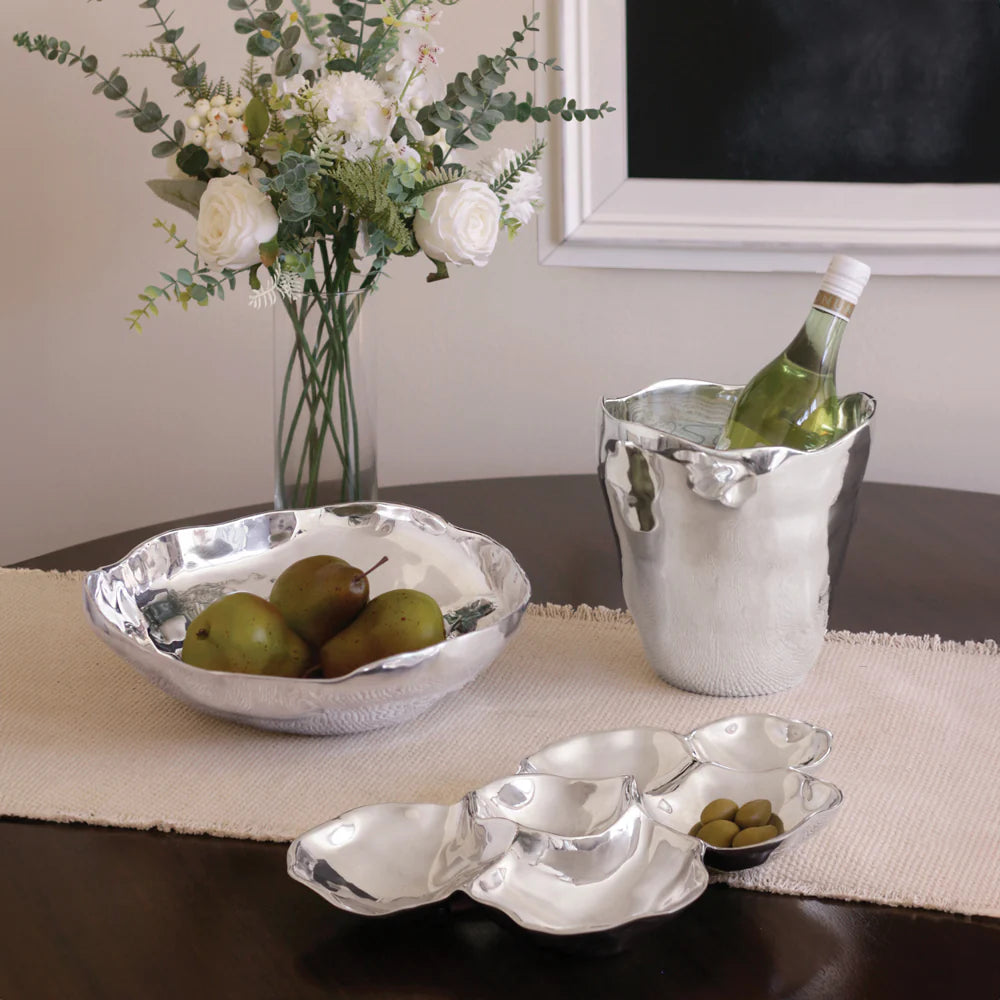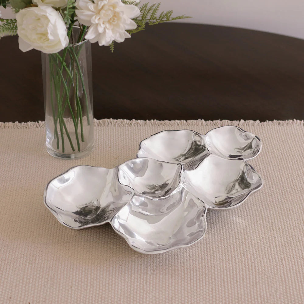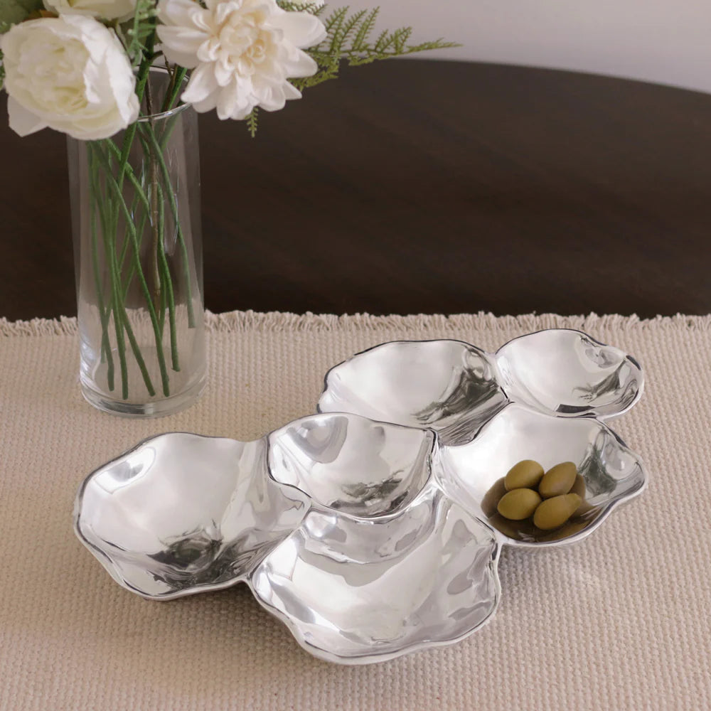 Here's richness! Like a work of modern sculpture for the table, you'll find a thousand uses for the six-chambered Beatriz Ball SOHO Multi Chip and Dip. Its gleaming artistry makes for a great conversation starter at parties. Perfect for dips, tapas, or garnishes. Use to serve nuts, olives, and nibbles at your next get-together. Makes a thoughtful gift. Beatriz Ball’s intensely handmade products employ eco-friendly and sustainable materials and are crafted by artisans who trace a heritage of metalworking for generations. An original Beatriz Ball design, sustainably handmade of a top quality, FDA safe, easy-care aluminum alloy. Hand wash and dry. Dimensions: 15.5" L x 10" W x 1" H