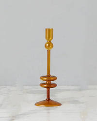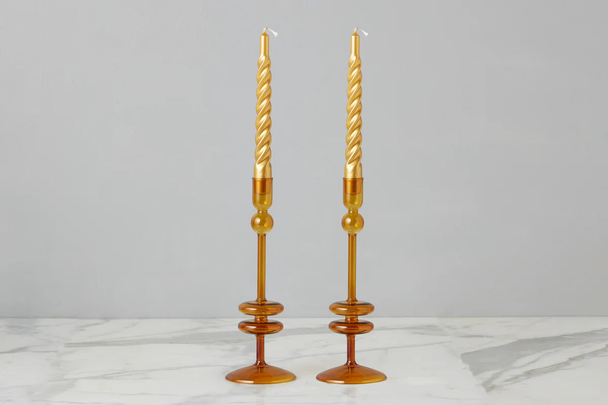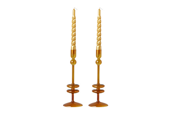 Elevate your home decor with a pair of Amber Glass Candlesticks. These expertly crafted taper candle holders add a touch of timeless elegance to any room. Available in three sizes and colors, they are perfect for adding a pop of color to your dinner party or creating a statement throughout your home. Mix and match the sizes and colors to create a memorable tablescape.