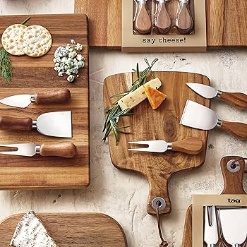 Entertain with style! impress your guests with a dramatic charcuterie board presentation of bread, cheese, cured meats, and more. each board is made from sustainable acacia wood by skilled artisans. set is perfect for gifting.