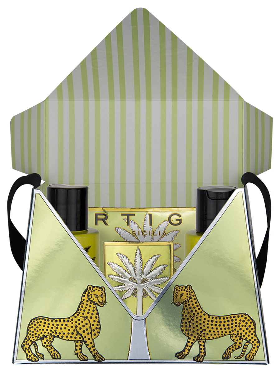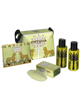 Brightly coloured bags with leopard print interior, containing Ortigia's natural scented products in miniature, suitable for gifts or travel. Italian style meets the history and magic of Sicily.