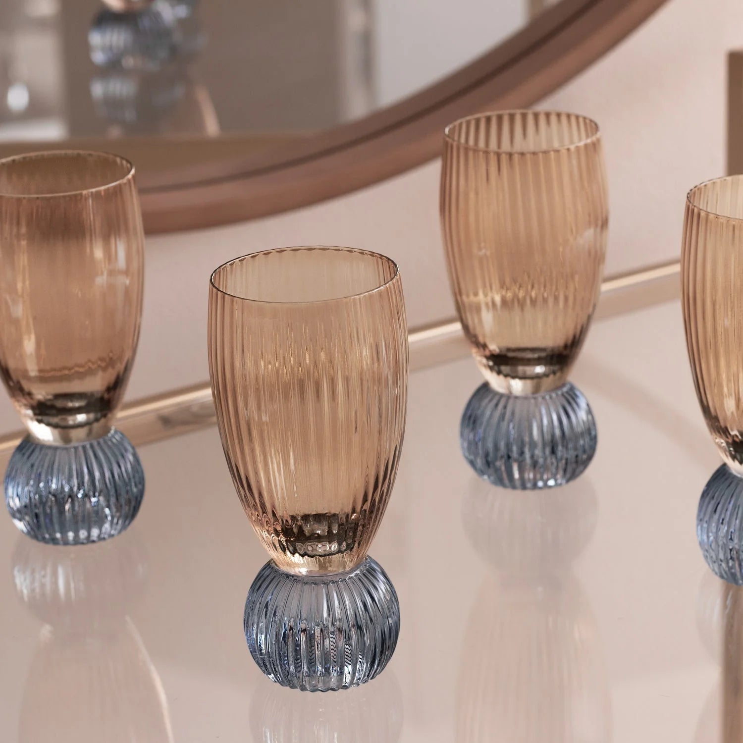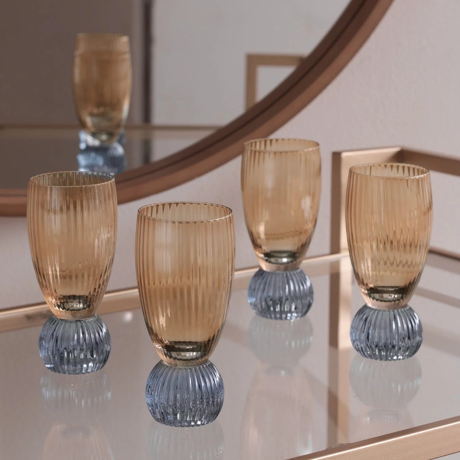 Worth a shot! Beautifully fluted, featuring lustrous colors and a spherical base, our GLASS Venice Shot Glass Set of 4 (Amber and Blue) adds sparkle to any bar or tablescape. Hand painted glass with a watercolor luster and brilliance enhances any sip. Great for tequila! Made exclusively for Beatriz Ball. Hand wash with soft sponge and mild detergent using lukewarm water; wipe dry with soft cloth.