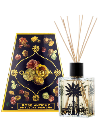 Natural reeds in a lovely signature bottle. The perfumed liquid travels through the sticks, releasing the subtle and continuous fragrance of Damask and Alba roses.