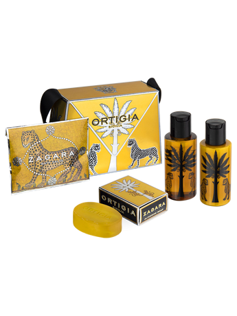 Brightly coloured bags with leopard print interior, containing Ortigia's natural scented products in miniature, suitable for gifts or travel. Italian style meets the history and magic of Sicily.