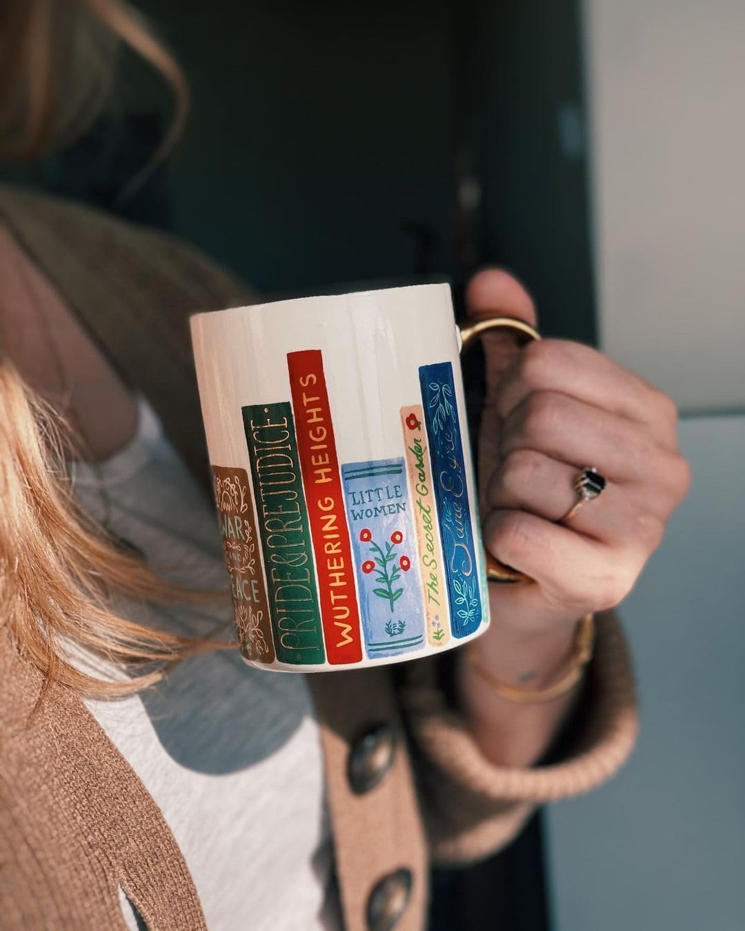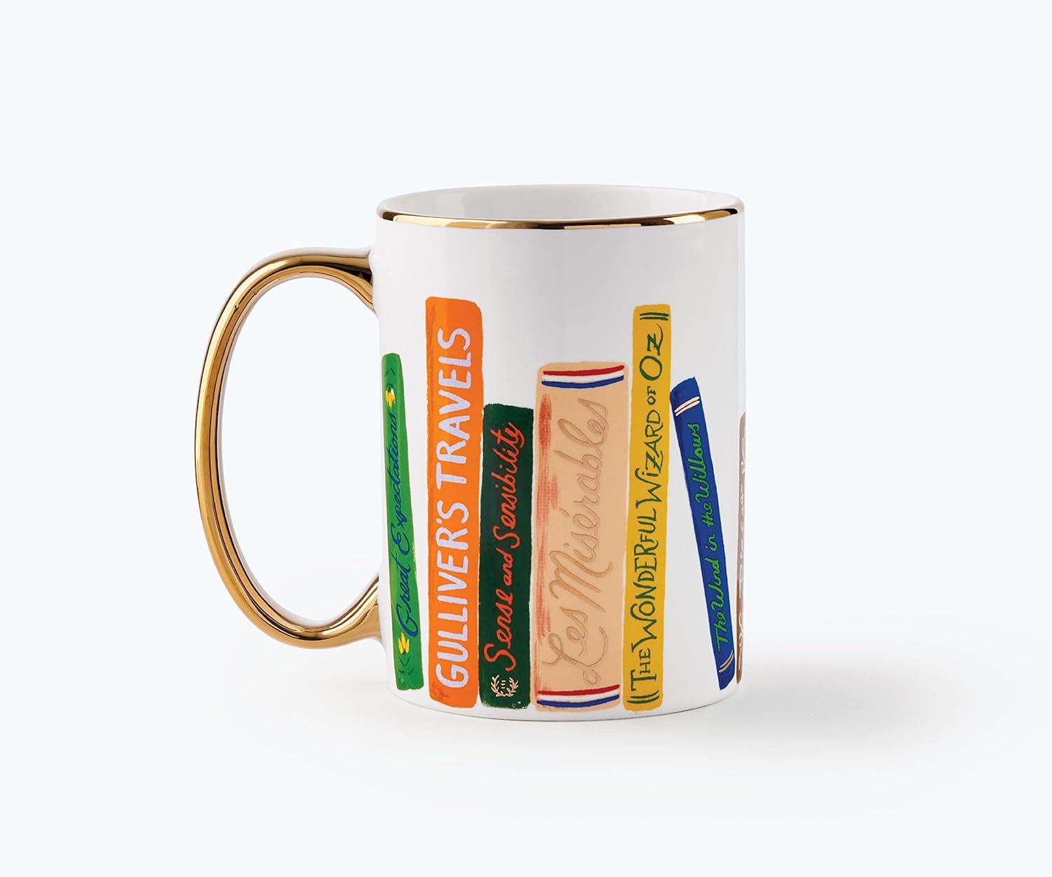 Settle in with a warm drink and a good book with our Book Club mug, featuring our favorite classic titles. Our porcelain mugs feature illustrated designs and a gilded rim and handle to add a little something special to your favorite beverage.