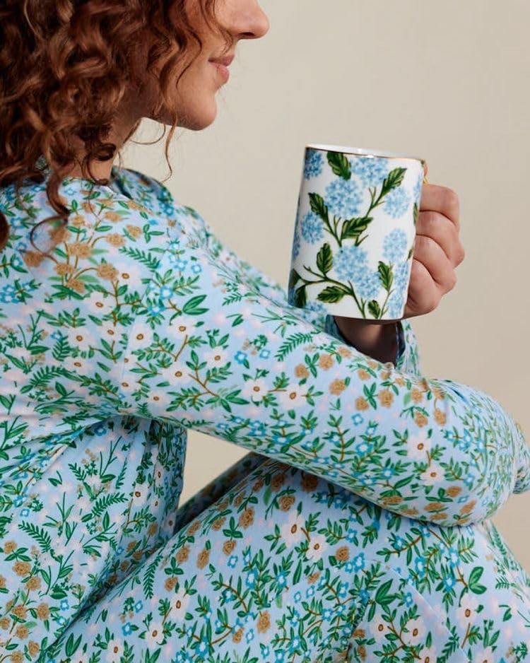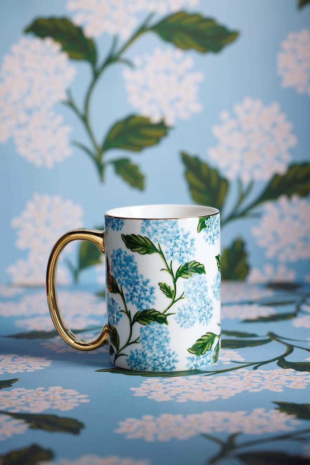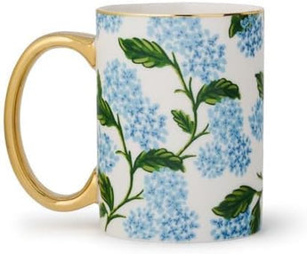 A timeless design of hydrangeas bloom on this porcelain mug, with a gilded rim and handle to add a little something special to your favorite beverage.