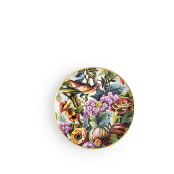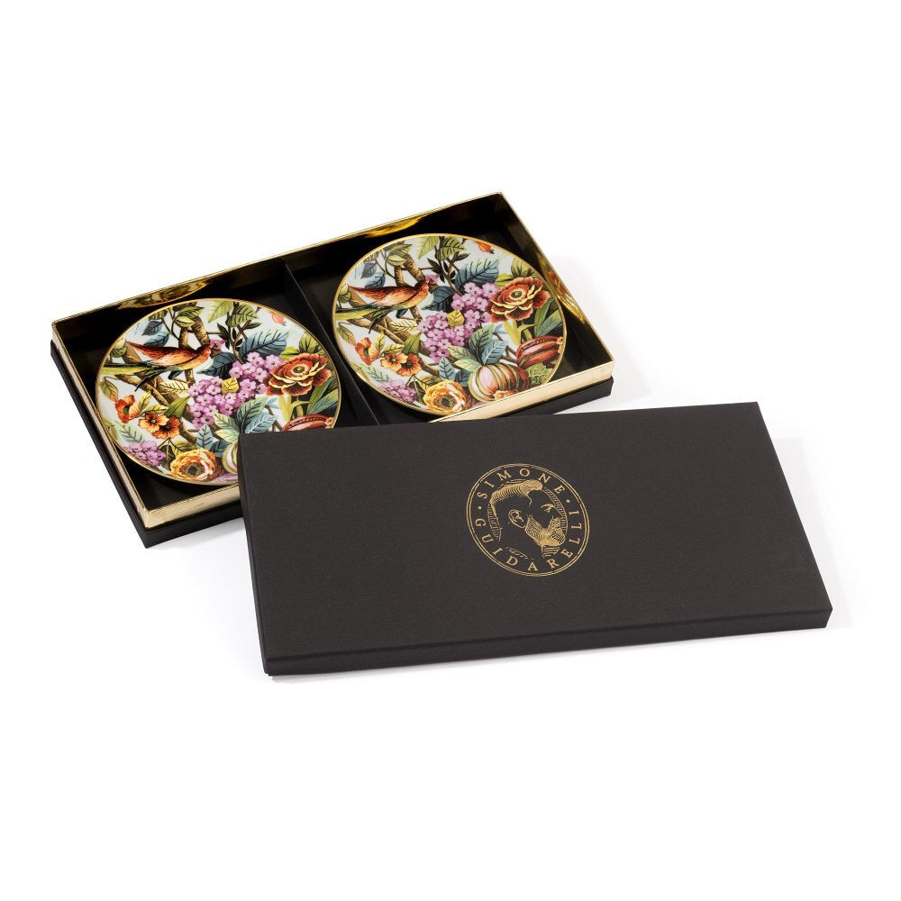 The collection of porcelain plates and accessories Exotic Jungle is presented inside an elegant padded gift box and finished with border, logo by Simone Guidarelli and printed gold details.